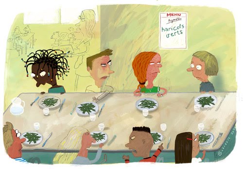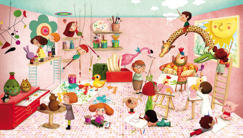 También es muy habitual este recurso como composición...situar varios personajes alrededor de algún objeto, sea una mesa donde se reúnan a comer o a jugar, una pizarra donde estén mirando qué hay escrito, una televisión que consiga agrupar a varios niños a su alrededor viendo los dibujos o jugando a una consola, varios personajes alrededor de un árbol que quieren plantar y regar, varios astronautas alrededor de un cohete espacial...en fin...personajes alrededor de cualquier objeto que se nos pueda ocurrir, un objeto que mantenga al grupo en una acción concreta.