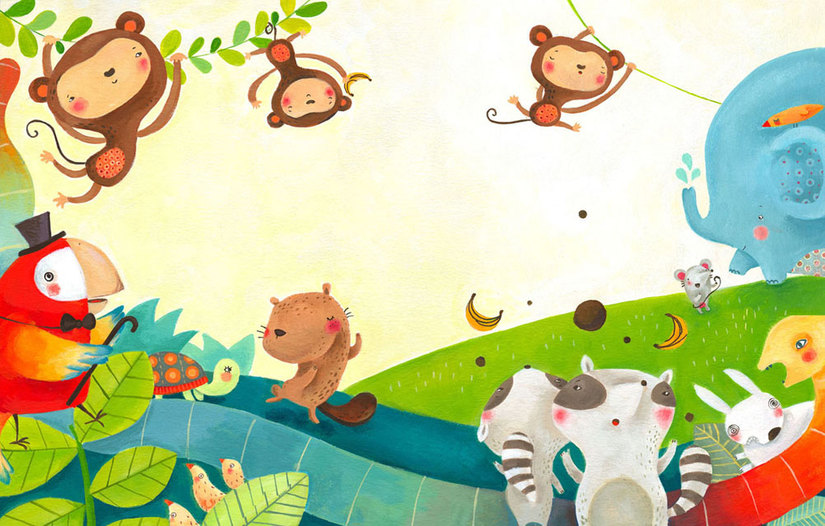Situados de forma frontal, sin ninguna perspectiva, podemos presentar a nuestros personajes unos encima de otros como los míticos "Músicos de Bremen". Este tipo de composiciones son muy divertidas y gustan mucho a los más pequeños.