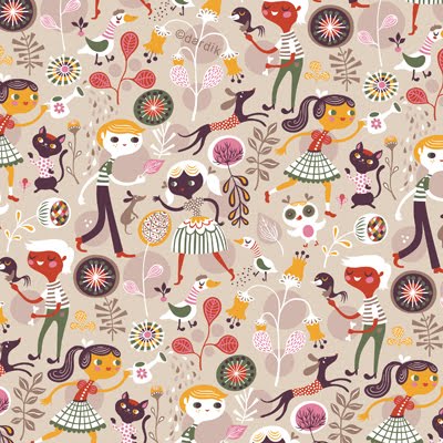 Muchos de los patterns (papeles pintados para forrar paredes) infantiles utilizan este tipo de composición, en el blog de la gran ilustradora Hellen Dardik podemos encontrar una gran variedad, aquí os dejo uno de ellos: