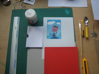 - para forrar los cartones recortamos nuestra ilustración de tal manera que sobre un poco. 2 cm está bien. Ponemos la ilustración boca abajo y aplicamos sobre el cartón el látex desde el centro hacia afuera.
